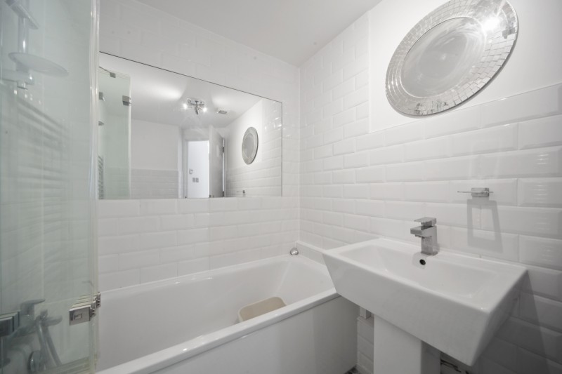 - Modern, neutrally decorated bathroom suite with bath, overhead shower, wc and sink